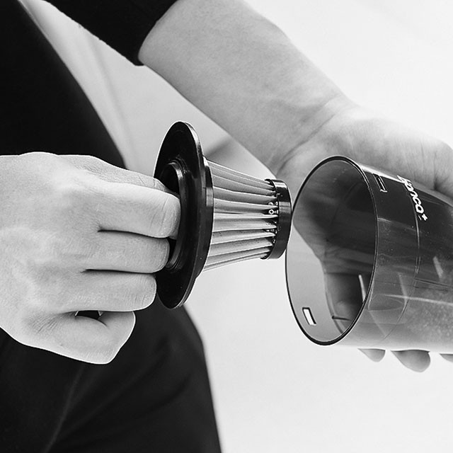 ダスト容器はワンタッチで外せるからゴミ捨てが簡単。容器とフィルターは水洗い可能で清潔に使い続けられる。