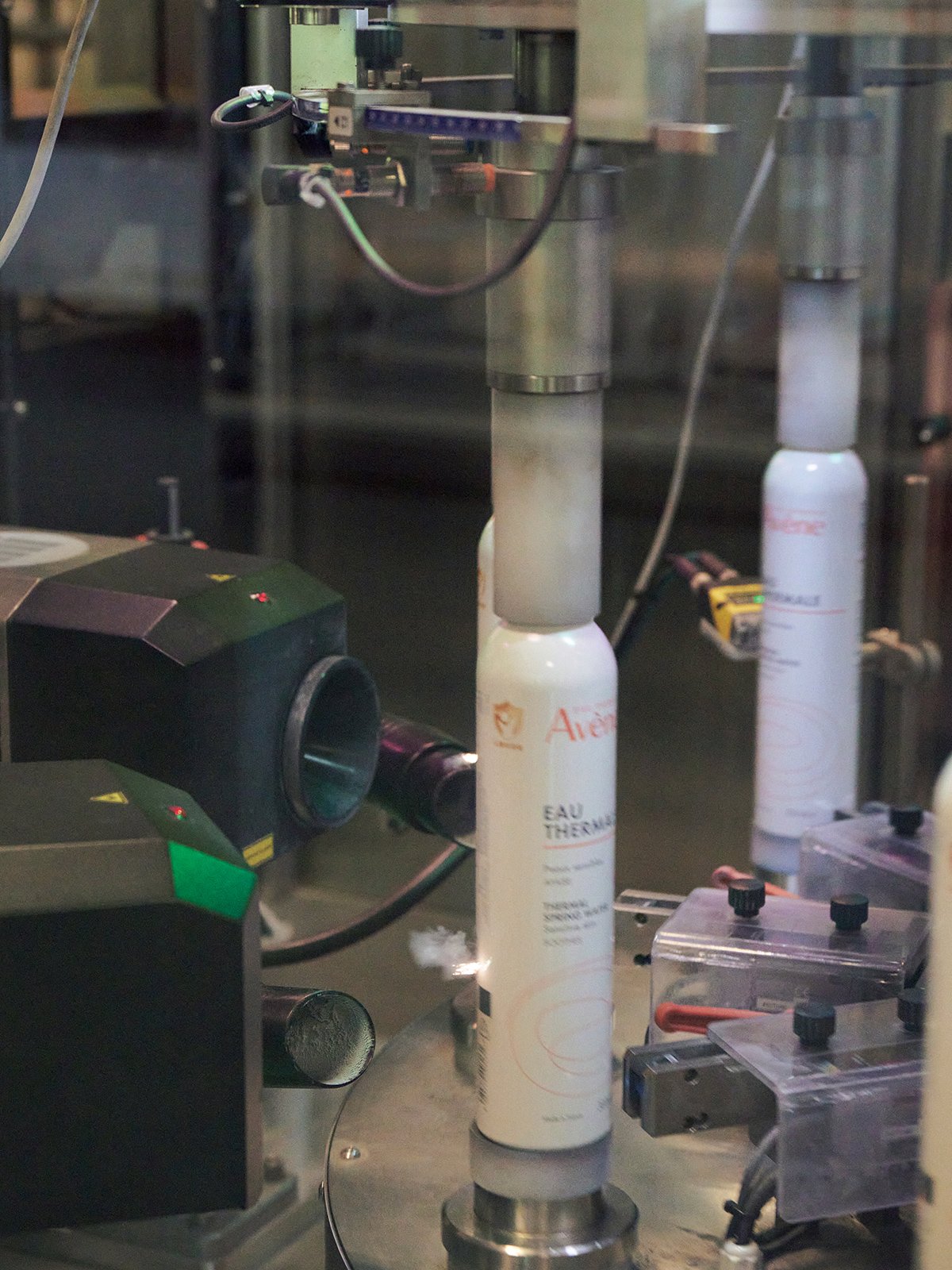 「アベンヌ ウオーター」の製造は、ボトルそのものや充填する場所など、すべてのゾーンを無菌状態にすることからスタート。アベンヌ温泉水を注入して蓋を乗せ、窒素ガスを入れて外蓋をのせるという工程。10分ごとにサンプル用のアイテムをピックアップして検査に回すというから、いかに品質の担保を重視しているのかがわかる!