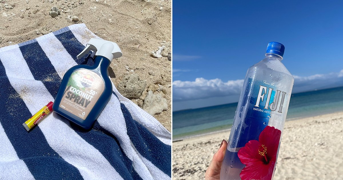〈左〉Le Tanは、ビッグボトルを購入しましたが、3分の2は使いました。スプレータイプで塗り直ししやすかったです。そして、うっかり日焼けするのが唇。リップケアの定番CARMEXもひっきりなしに塗り直しました。〈右〉水分補給は、もちろんフィジーウォーター!