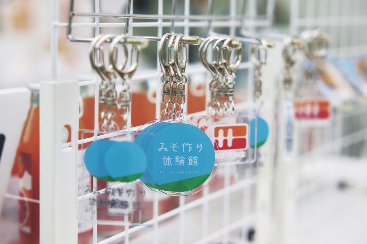 みそや塩こうじなどのハナマルキ製品と、おしゃれでかわいいみそ作り体験館オリジナルグッズを入手できるコーナーも。いろいろ購入してしまいました。