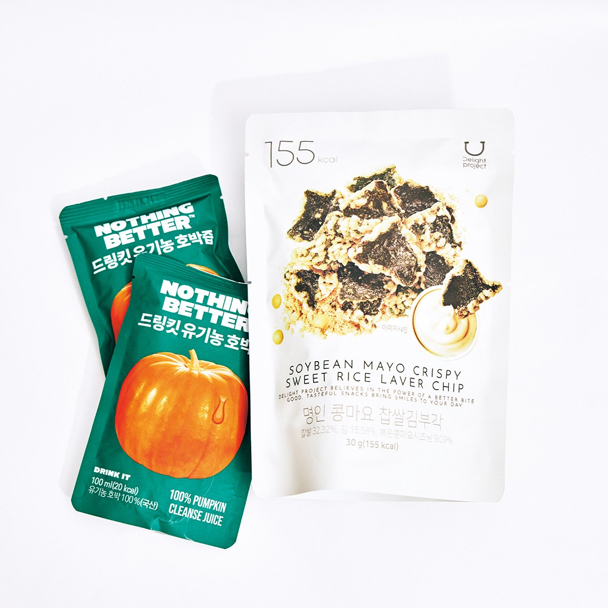 韓国で注目度の高いインナーケアも豊富Delight Projectののりチップス(3,500W)やむくみに効果的なNOTHING BETTERのカボチャジュース(1,600W)を購入。