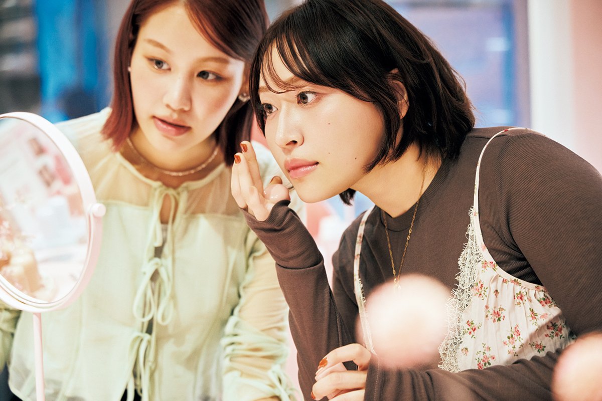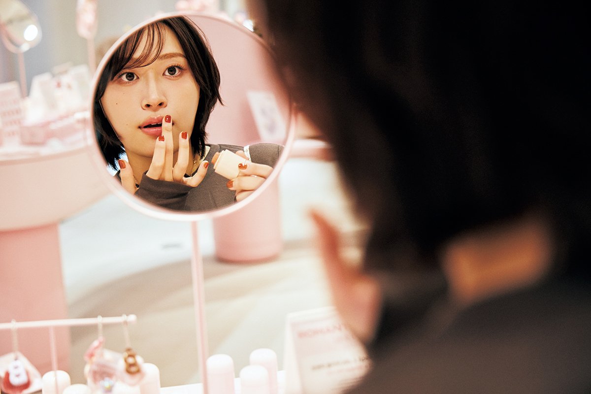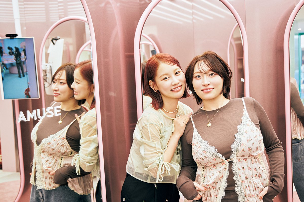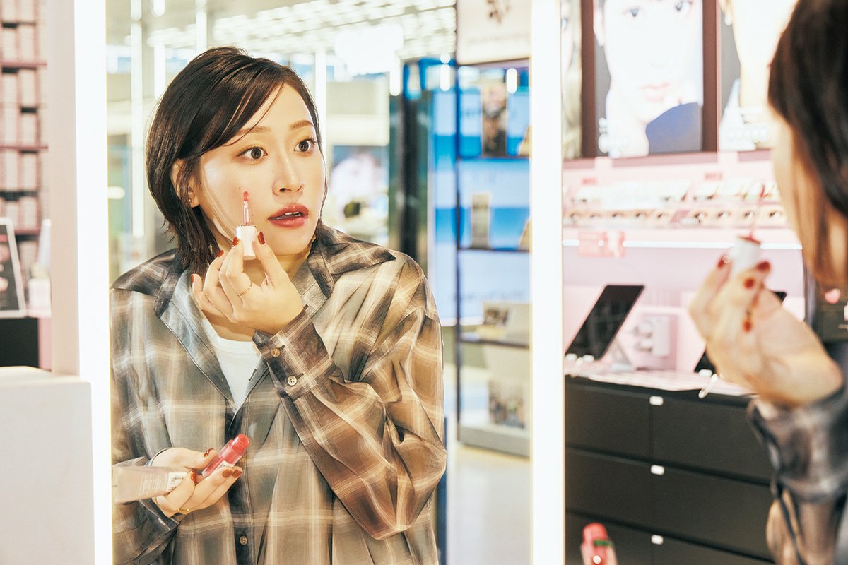 大きな鏡が並ぶタッチ&トライコーナーでおすすめコスメをチェック。「礼さんなら、このチークが似合いそう♡ 」と小澤さんにおすすめカラーを教えてもらう一幕も。