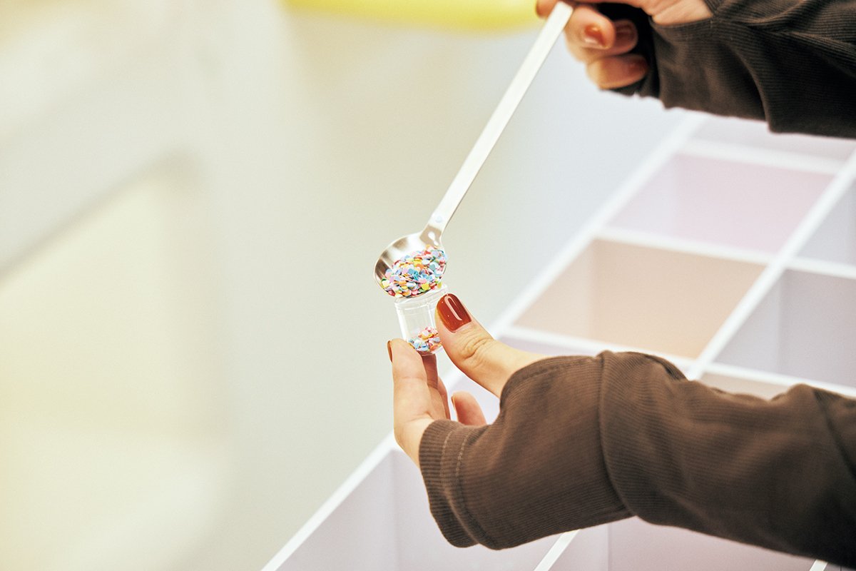 べべティント、デューティント、ジェルフィットティントを購入すると、好きな文字を刻印できるサービスのほか、キャップの中に好きなビーズを入れてデコれるDIY体験も!ふたりとも真剣にビーズを詰めていきます。