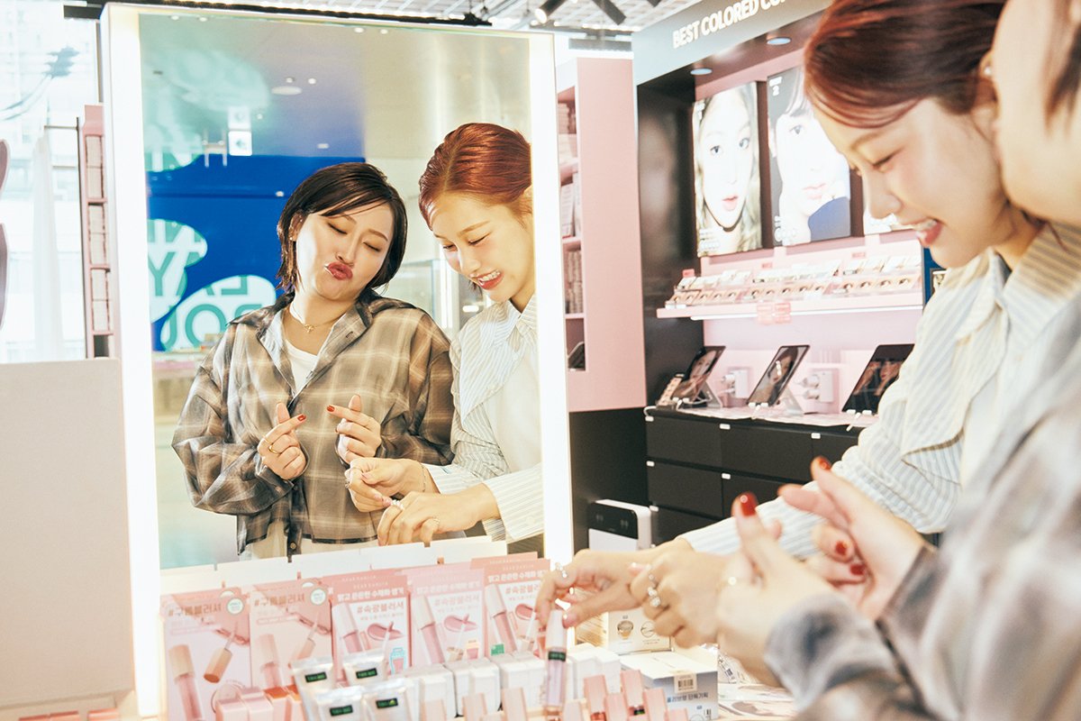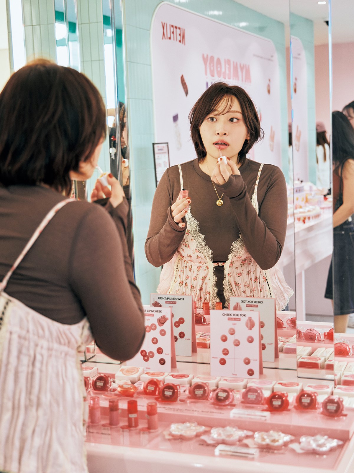 日本でも人気なクレンジングバーム、クッションファンデをはじめ、チークやアイシャドウなどのコスメがそろう、今年5月にオープンしたフラッグシップストア。店内でできるDIY体験がSNSを中心に話題となっており、丸山さんもSNSで“クッションファンデデコ”を見て、絶対やりたい!と気になっていたのだとか。