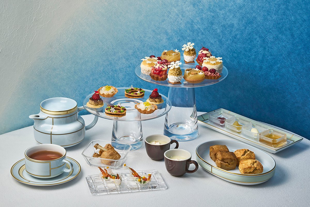 トナカイをイメージしたベリーとチョコのケーキや、マロンクリーム香るモンブラン、黒毛和牛のフリットなど、スイーツとセイヴォリー計11種が、ツリー型のスタンドに華やかに並びます。