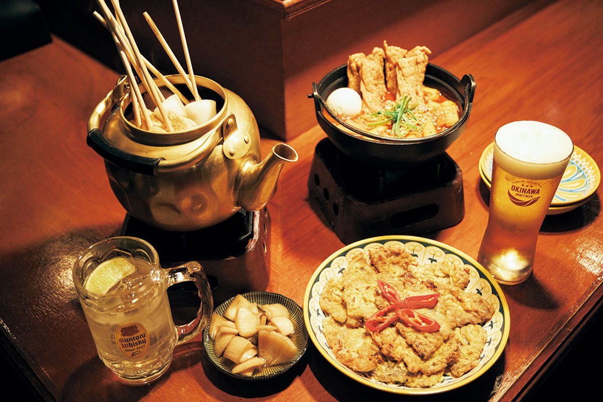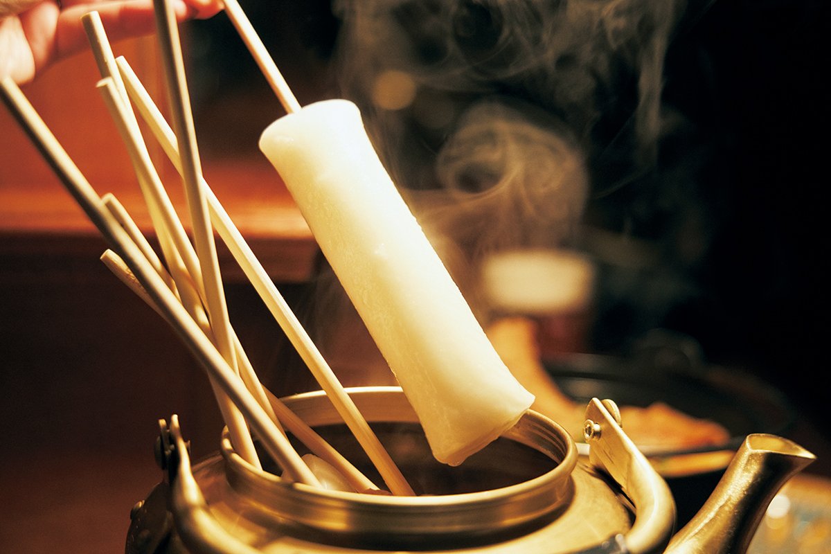 棒状の餅“カレトック”を食べたい!という小澤さんのリクエストでやってきたDEN Q。店内は日本歌謡曲やアニメが流れ昭和レトロな雰囲気。名物のおでんは韓国風でだしを別添えの揚げ玉入りのカップに注ぎスープとして味わうのもおすすめ。トッポギやお肉のチヂミなども絶品で韓国で流行中のハイボールとの相性も◎!