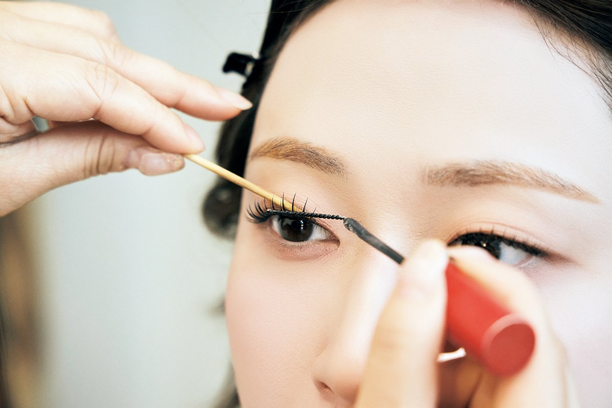 韓国メイクの定番!温めたマスカラコームでまつげを上げていきます。