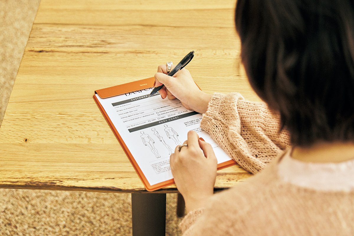 今回体験したのは80分154,000Wのコース。施術前にはアンケートを記入。触ってほしくない部位なども申告できます。日本語表記もあるので安心です。