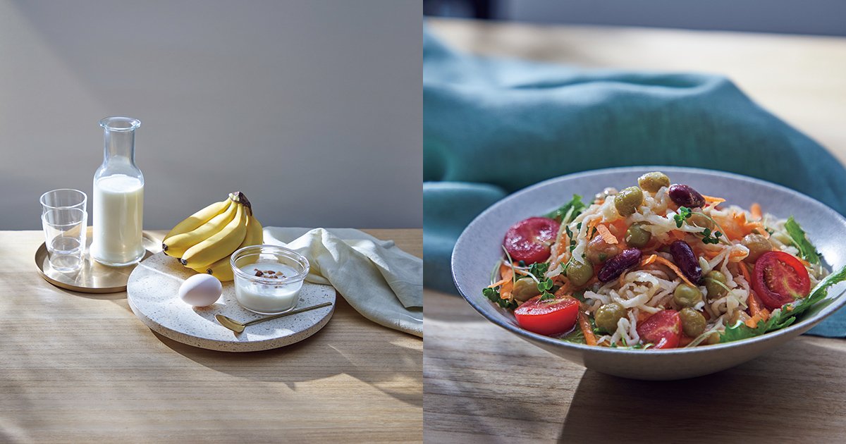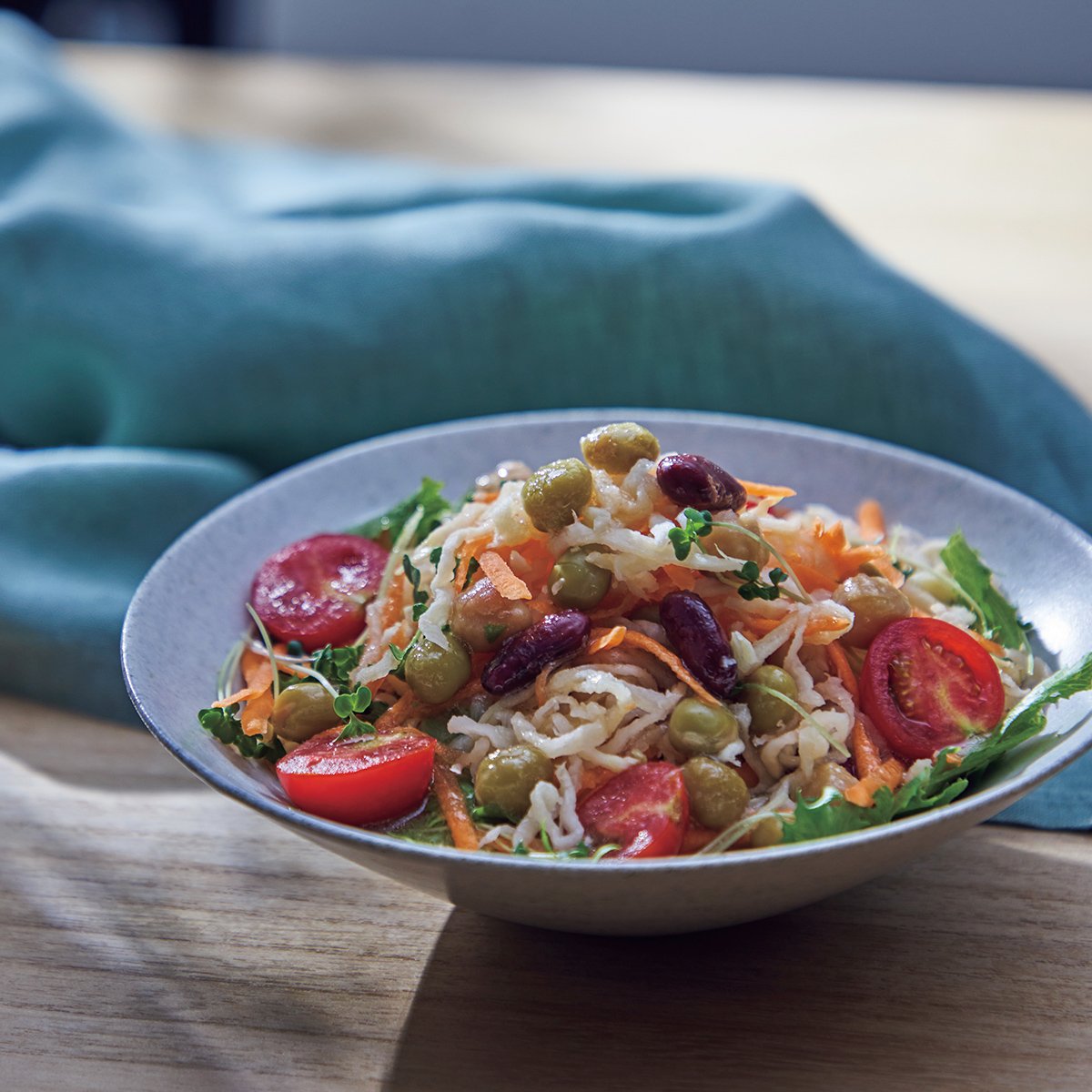 “しっかり咀嚼する”こともセロトニンの生成を促し、夜の睡眠の質向上に役立ちます。切り干し大根やミックスビーンズ、にんじんなど食物繊維が豊富でかみ応えのある食材をサラダにするのもおすすめ。腸内環境が整うことで自律神経が安定し、安眠につながります。