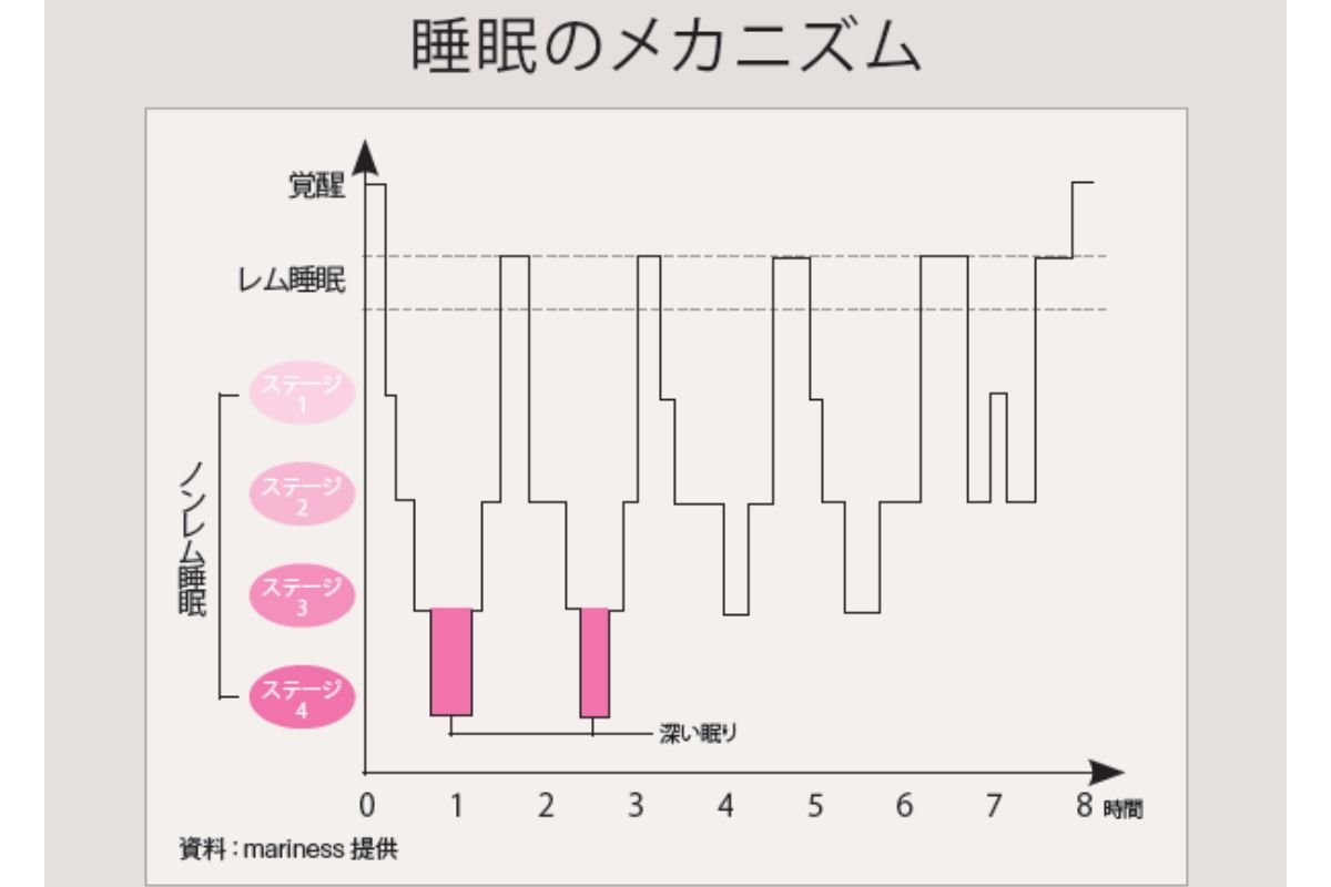 ひと晩の理想的な睡眠サイクルは、深い眠りの「ノンレム睡眠」と浅い眠りの「レム睡眠」を交互に4 ~ 5 回繰り返します。睡眠休養感を高めるには、睡眠直後の2 ~ 3時間以内にまとめて深く眠ることがポイントに。「なかなか寝つけない、寝てもすぐに目が覚めてしまう人は、寝具や寝室環境を見直してみましょう。特に肌に直接触れるパジャマは体の放熱にも影響するので、機能性や着心地にもこだわりたい」(八木先生)。さらりと肌離れが良く体を冷やさない、締めつけないパジャマなら朝までぐっすり!