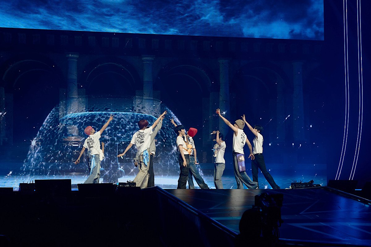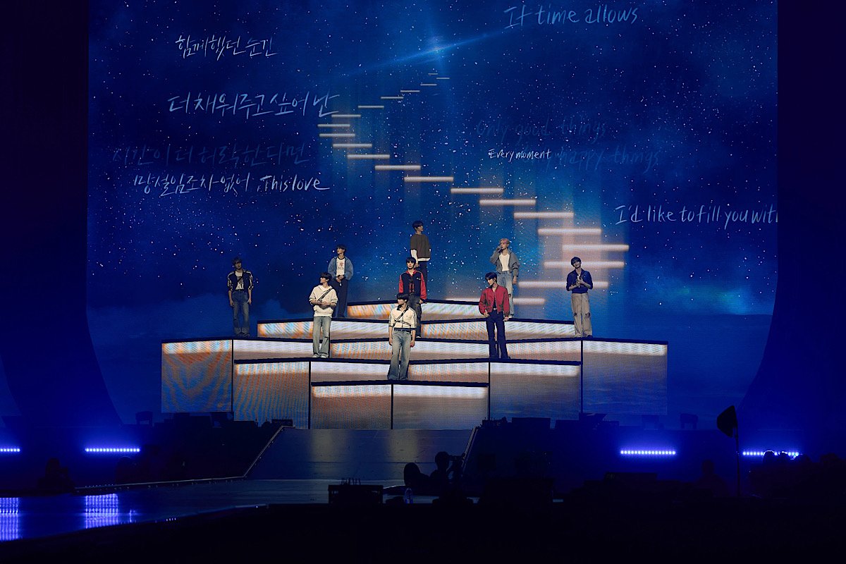 ZEROSEに伝えたいことをギュッと込めたファンソングの『I Know U Know』をメインステージでしっとりと歌い上げた後、9人でギュッと寄り添って座りながら『HANA』を歌い、彼らのデビューのきっかけになったグローバルボーイズグループデビュープロジェクト『BOYS PLANET』の課題曲である『Here I Am』そして『Star Eyes』までを歌い、サインボールを投げてファンサービス♪