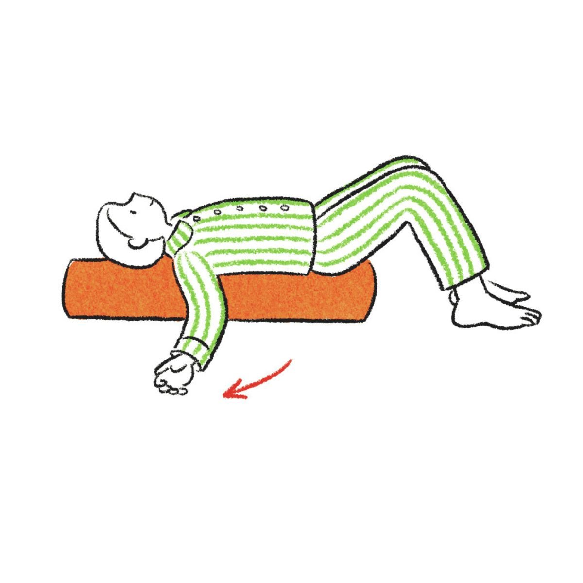 ひじを床につけたまま両腕を肩の高さまで上げ、ゆっくり元の位置に戻して1セット×5回。ストレッチポールがなければバスタオルを丸めて代用してもOK。