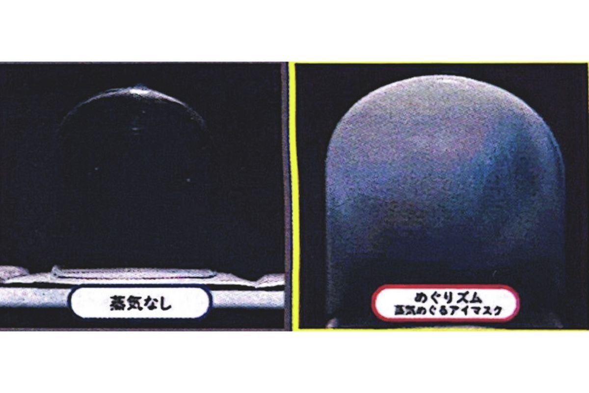 アイマスクにグラスを当てて蒸気量を検証。約113%*1*2もの目もとめぐる蒸気量が発生。たっぷりの蒸気がアイマスクを満たします。