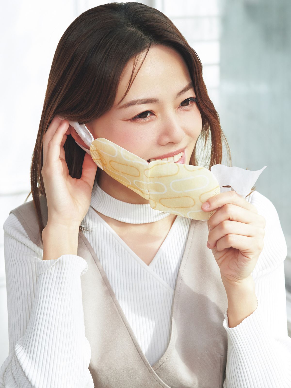 横方向へのシートの伸びやすさも約162%*1向上。「引っかけた耳や目元の触れ心地がふんわりやわらかくて気分までとろけそう」(武田さん)