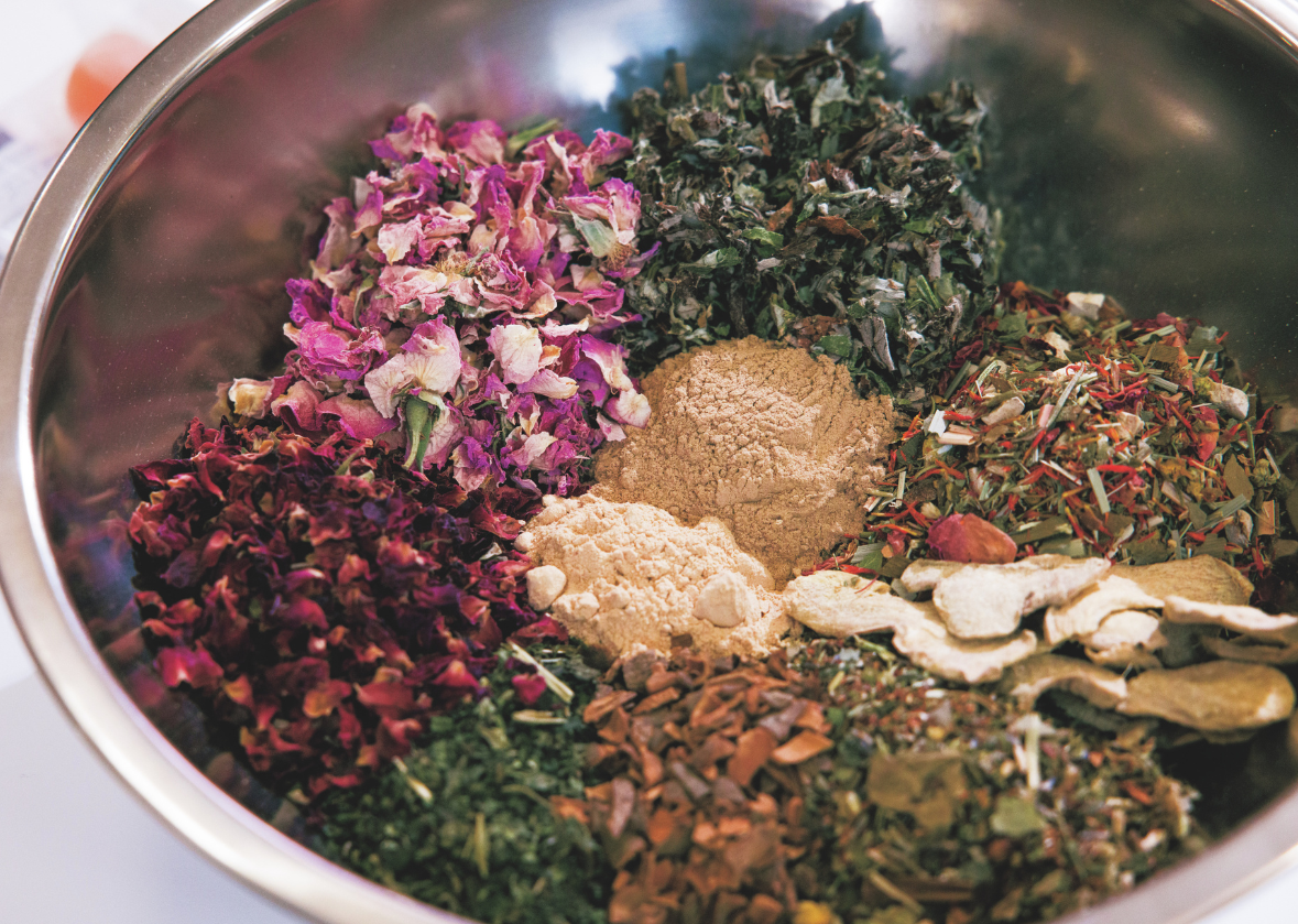 冷えをケアするハーブを中心に、シナモンやジンジャー、ヨモギ、ローズ、ネトル、マカなどを組み合わせた、私だけのブレンドティーが完成! 「寝る前に、濃いめに入れて飲んでくださいね」とアドバイスを受けました。