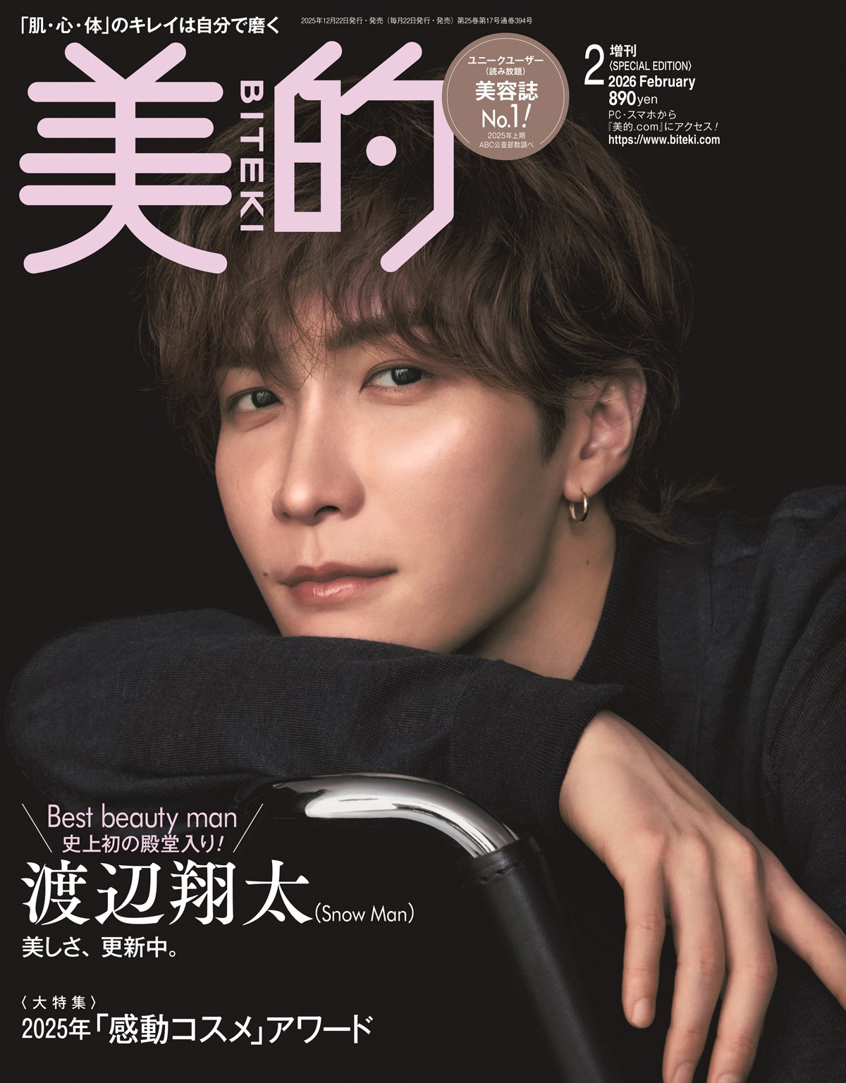 Snow Manとしてデビュー5周年を迎えた2025年は、スタジアムライブを初の単独開催、映画単独初主演に、バラエティ番組のMCにも初挑戦と、ソロ活動でも話題を集めた渡辺翔太さん(Snow Man)が3度目の「美的ベストビューティマン」で初の殿堂入り! 渡辺さんの美肌が映える黒バック×黒ニットという組み合わせで撮影を行い、『美的』2月号の表紙を飾りました。