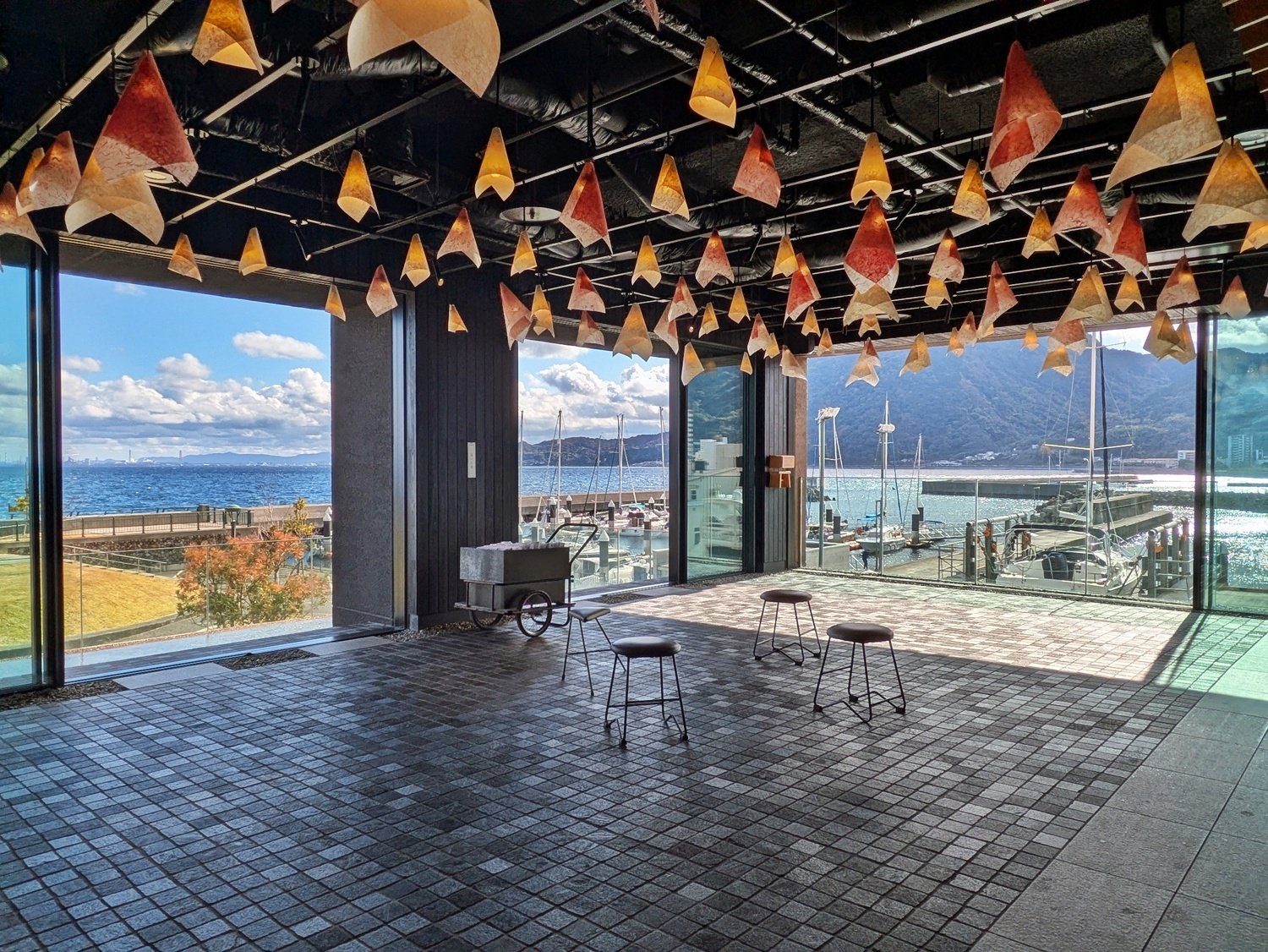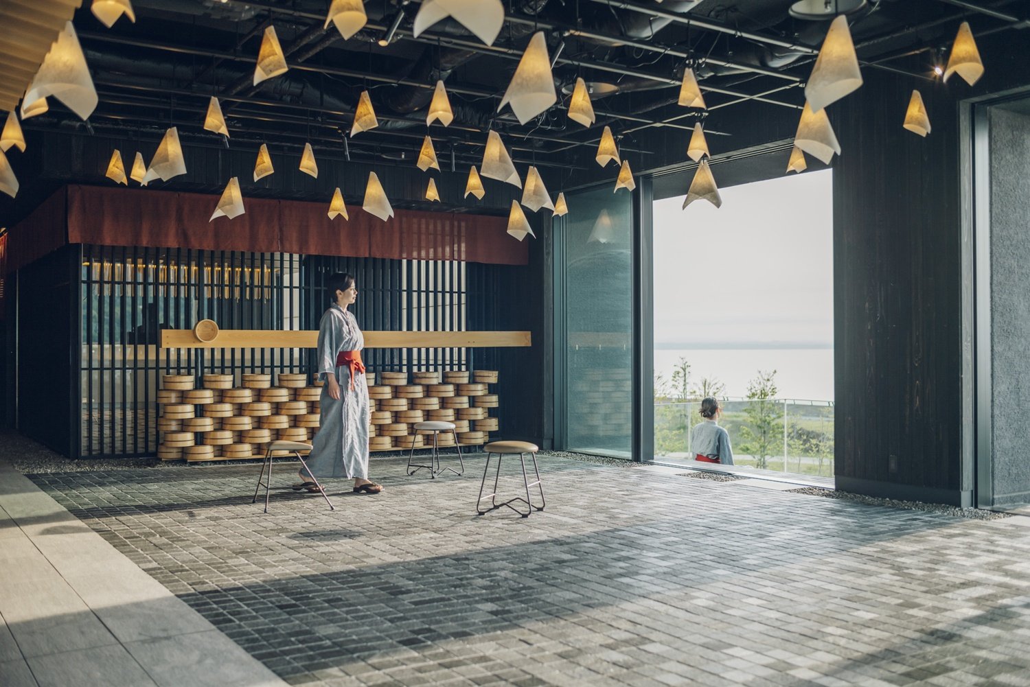 こちらの旅館のコンセプトは「ドラマティック温泉街」。別府湾のパノラマや時間により刻々と表情をかえる空や海の色合いを“ドラマティック”と表現。館内に足を踏み入れると、まず目にする天井のちょうちんや桶をモチーフとして手湯の装飾、その奥にある別府湾ビューの足湯など、思わずはっとするような光景が広がります。