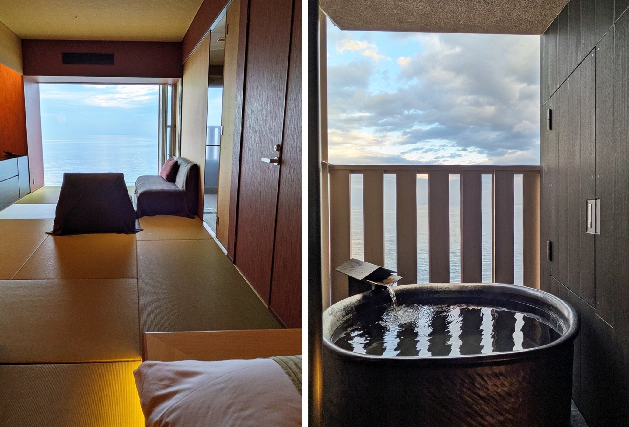 ひとまず、手湯や足湯で温泉体験をした後にチェックインしたら客室へ。今回宿泊するのは「露天風呂付和室」の部屋。部屋の奥には別府湾を切りとるように設置されたピクチャーウィンドウが! 眼下には漁船や野鳥が飛んでいるのが見えて、この景色を眺めているだけでも飽きません。