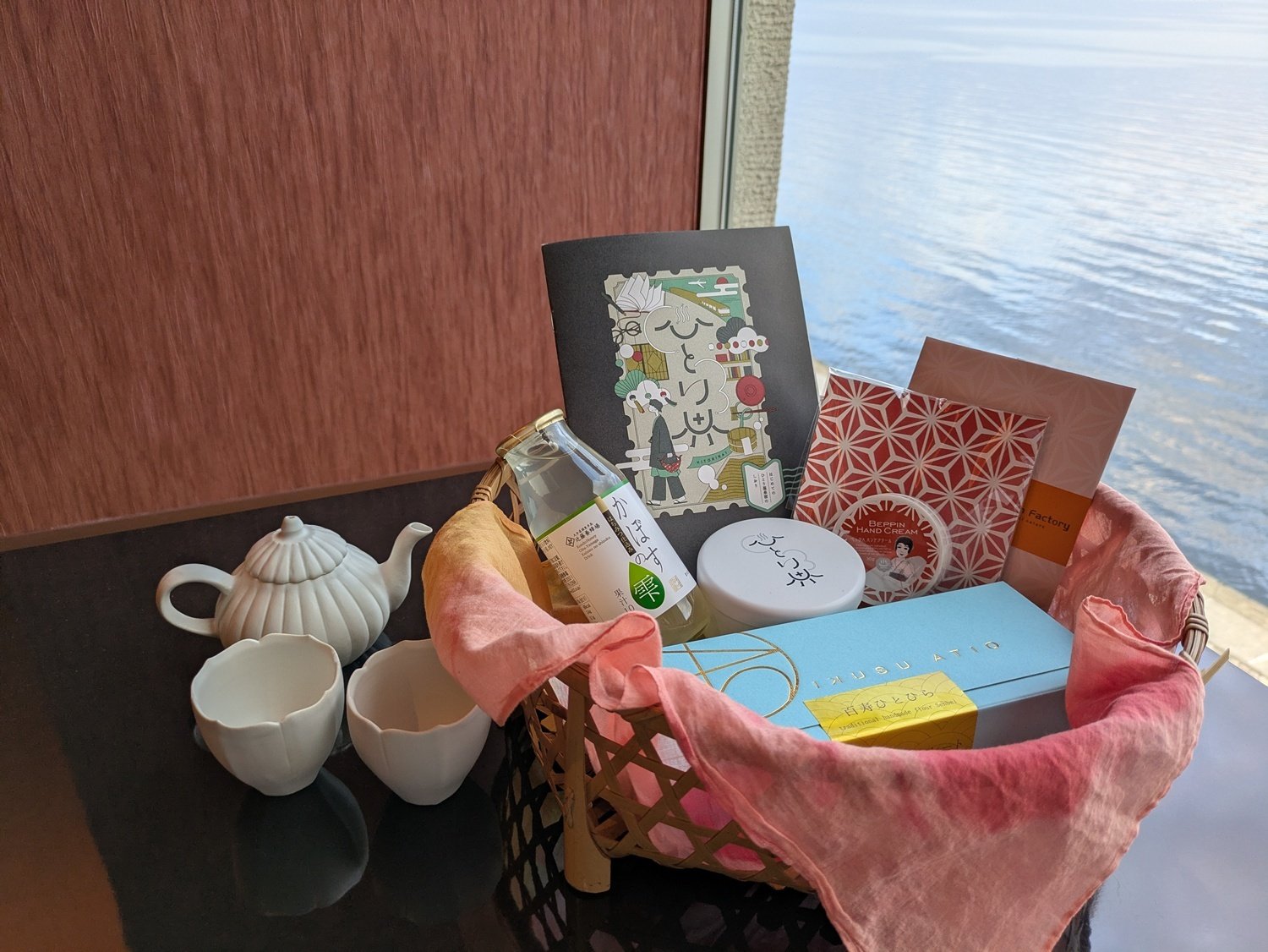 客室のテーブルには「ひとり旅」プランを選んだゲストに用意される特別ギフトが。おすすめの滞在スケジュールを記したしおりやウエルカムティー、かぼすジュース、ご当地菓子であるチョコレートと生姜をあわせた「百寿ひとひら」、さらに別府・紫石温泉の温泉水を40%と高濃度配合した「べっぴんハンドクリーム」やフェイスマスクもセットされており、想像以上に充実した内容でテンションが高まります。