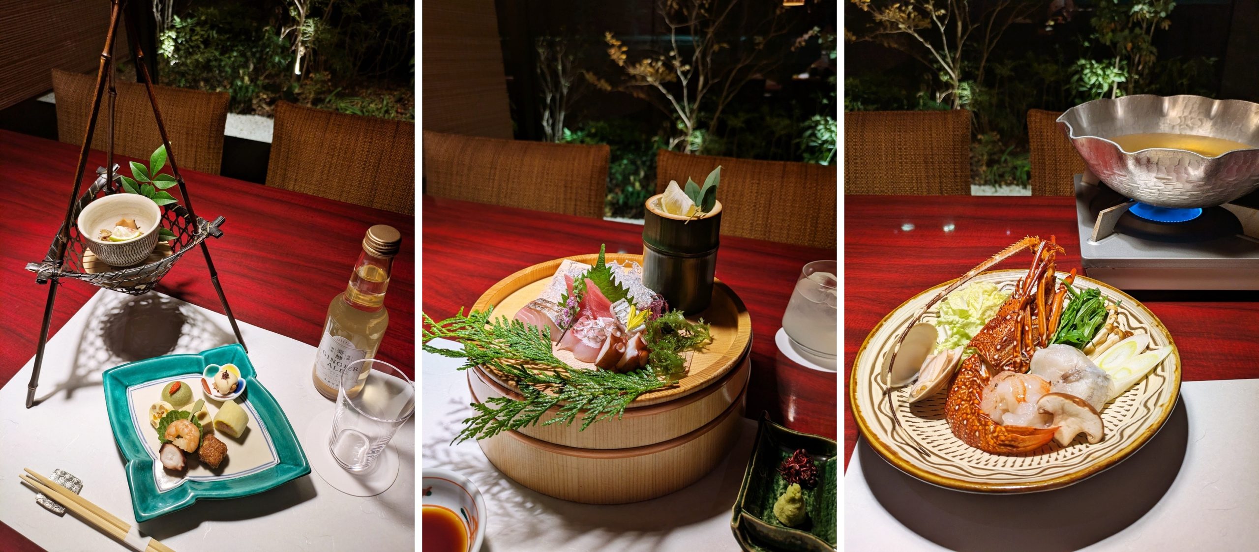 それぞれの料理は目にも楽しい演出で提供されます。伝統工芸品である竹細工の器を用いた先八寸や、温泉を感じる桶に本マグロやタチウオ、真鯛といった旬の魚介が盛られたお造り。メインである台の物は、この日は河豚やハマグリ、伊勢海老といった新鮮な魚介と旬野菜を鍋で味わい、最後に新鮮な魚を甘辛いタレで絡めた大分県の郷土料理「りゅうきゅう」をごはんにのせて味わいます。