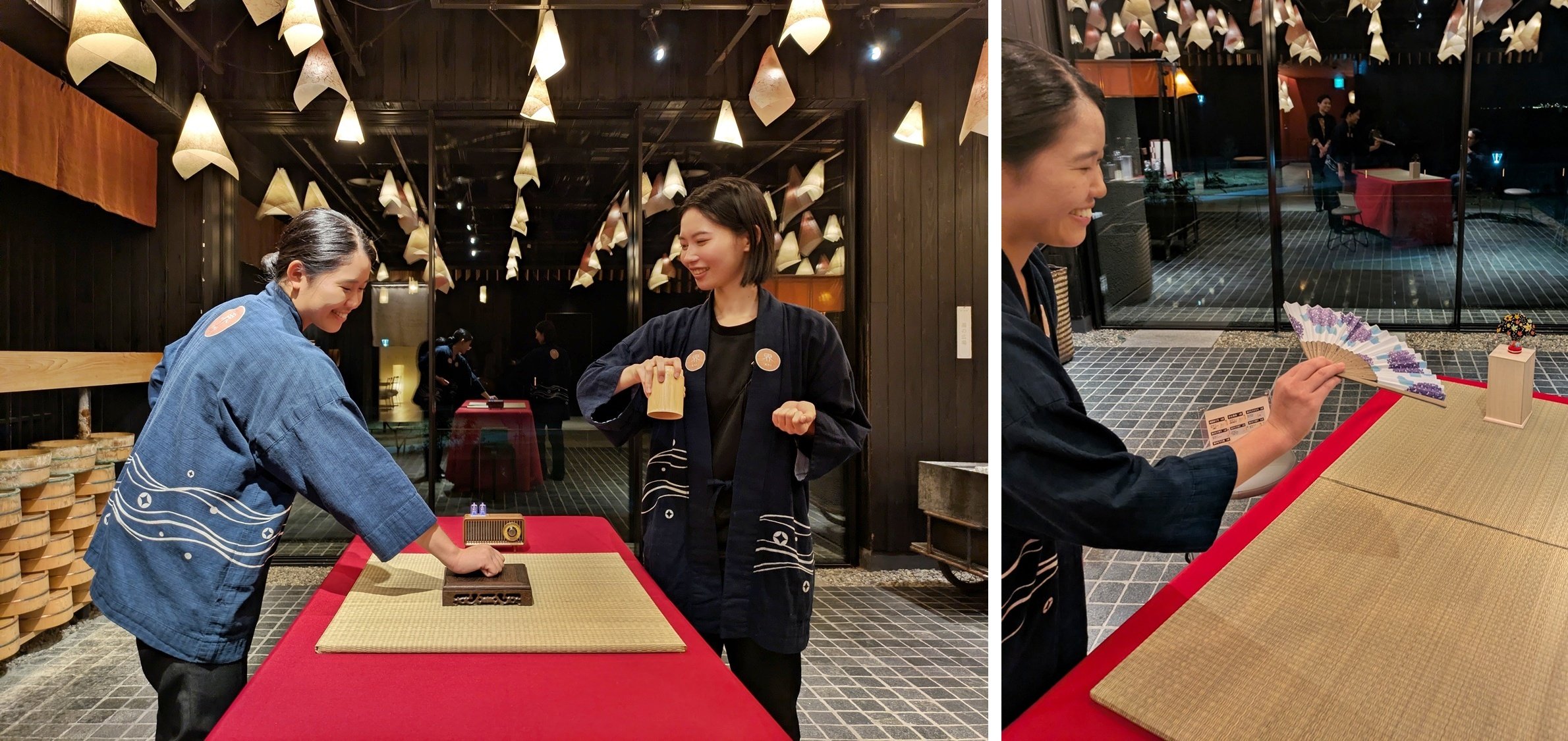 夕食後には、こちらの温泉旅館のコンセプトである「ドラマティック温泉街」を表現したアクティビティを開催。温泉街にある土産店や夜店をイメージした空間が広がり、昭和レトロな遊びである「スマートボール」や扇子を使った「投扇興(とうせんきょう)」、さらに、お風呂で使う道具から生み出された音色を楽しむ「湯治ジャグバンド」といった賑々しいアクティビティを楽しむことができます。