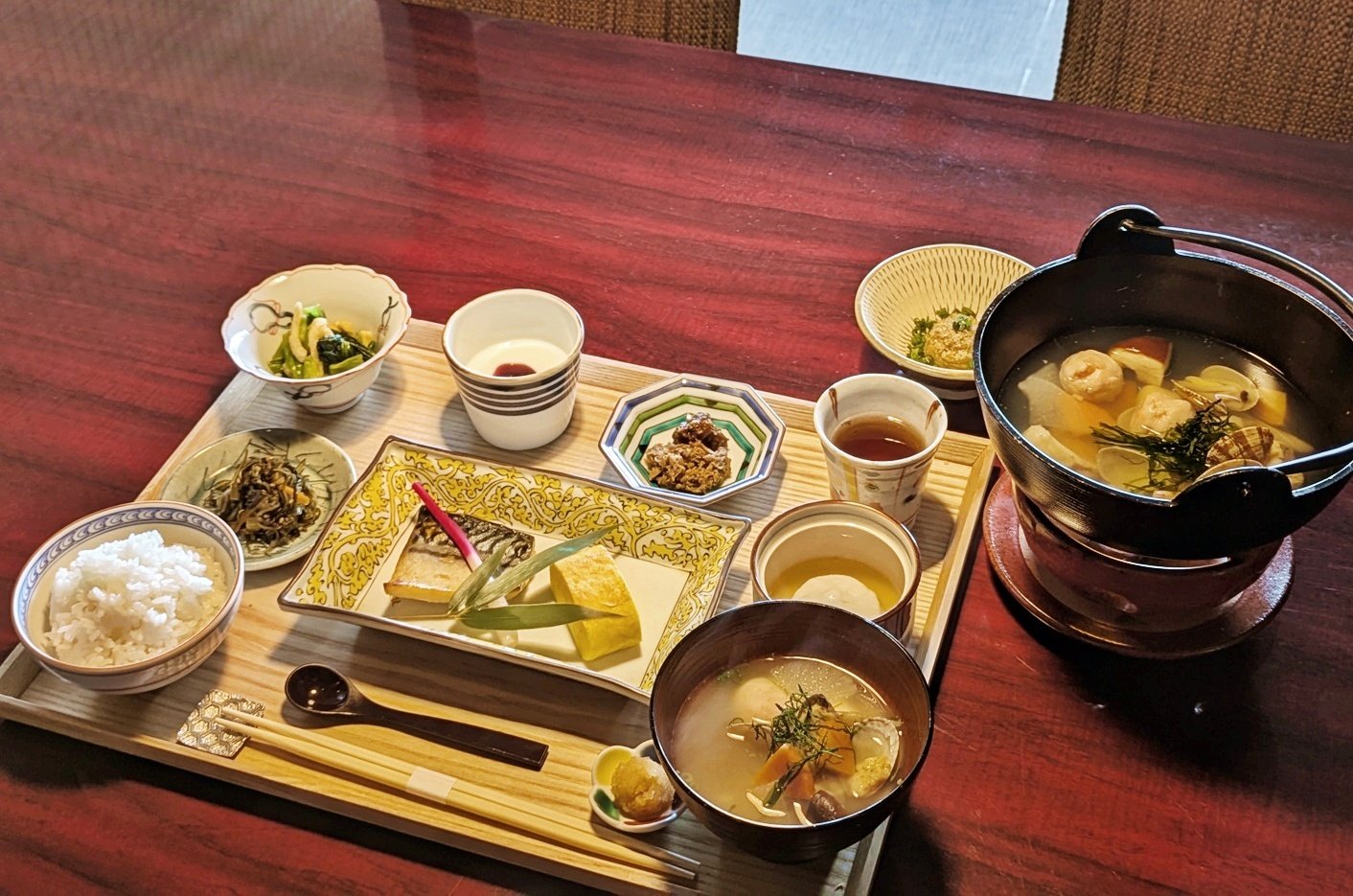 「界」ブランドは朝食に注力していることでも有名。こちらではご当地朝食として、大分県佐伯市で漁師過程を中心に受け継がれている「ごまだし」を使った海鮮汁がメイン。焼き魚、しょうゆ、ごま、みりんを練り合わたうま味たっぷりの調味料を使った郷土料理で小鍋で提供されるにも関わらず、完食するゲストも多いという一品。また、この日はサバのかぼす醤油漬けや里芋饅頭、館内ショップで購入できる“ごはんのお供”、「牛しぐれ」や「こんぶ梅」も提供されます。
