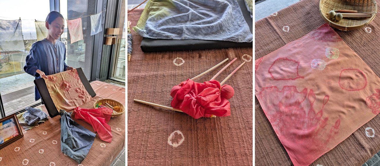 朝食後にもアクティビティが用意されていました。ご当地文化の「豊後絞り」にふれる「別府温泉しぼり体験」です。こちらは絞染め作家・安藤宏子さんが監修したアクティビティで、染物で木の棒や木球をくるんだ後、温泉に浸して染料を落とすことで模様をつけるという、一般的な染色とは逆の技法。なんとなく頭に浮かんだ仕上がりをもとに、いくつかの木材を包んだらスタッフへ。あとは、スタッフが染料を落としつつチェックアウトまでに染色が完成。今回は期待通り、オレンジと朱色の鮮やかなハンカチに。旅の思い出がお土産になりました。