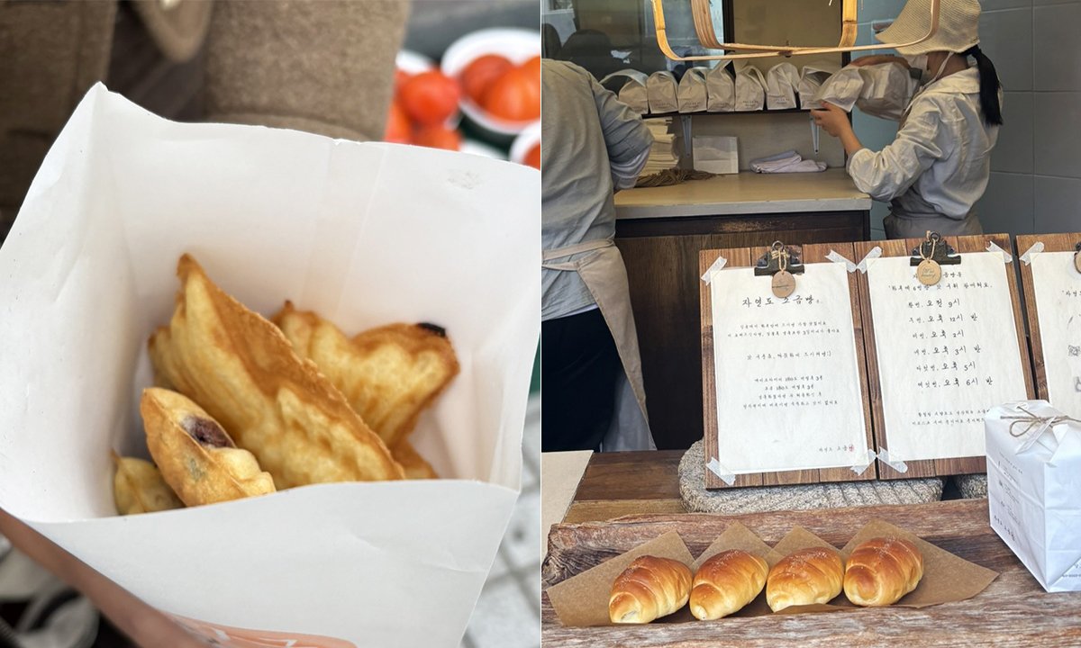 〈左〉屋台で見つけたたい焼き、おいしかった! 冬しか食べられないそう。〈右〉人気の「ジャヨンド塩パン」。行列ができていましたが10分程で購入できました。4つ入っていましたが、2つずつ、ペロリ。