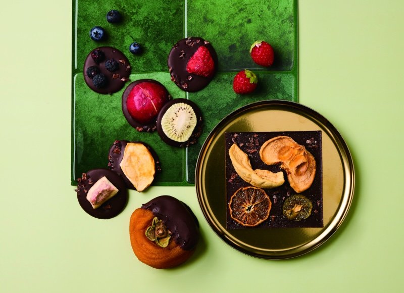 「チョコ果実園 堀内バナシ」フルーツチョコレート 6種セット(6枚入り)¥4,104、同 フルーツタブレット(1枚48g)¥2,700、同 五條のあんぽ柿ショコラ(1個入り)¥1,836(すべて阪急うめだ本店限定)