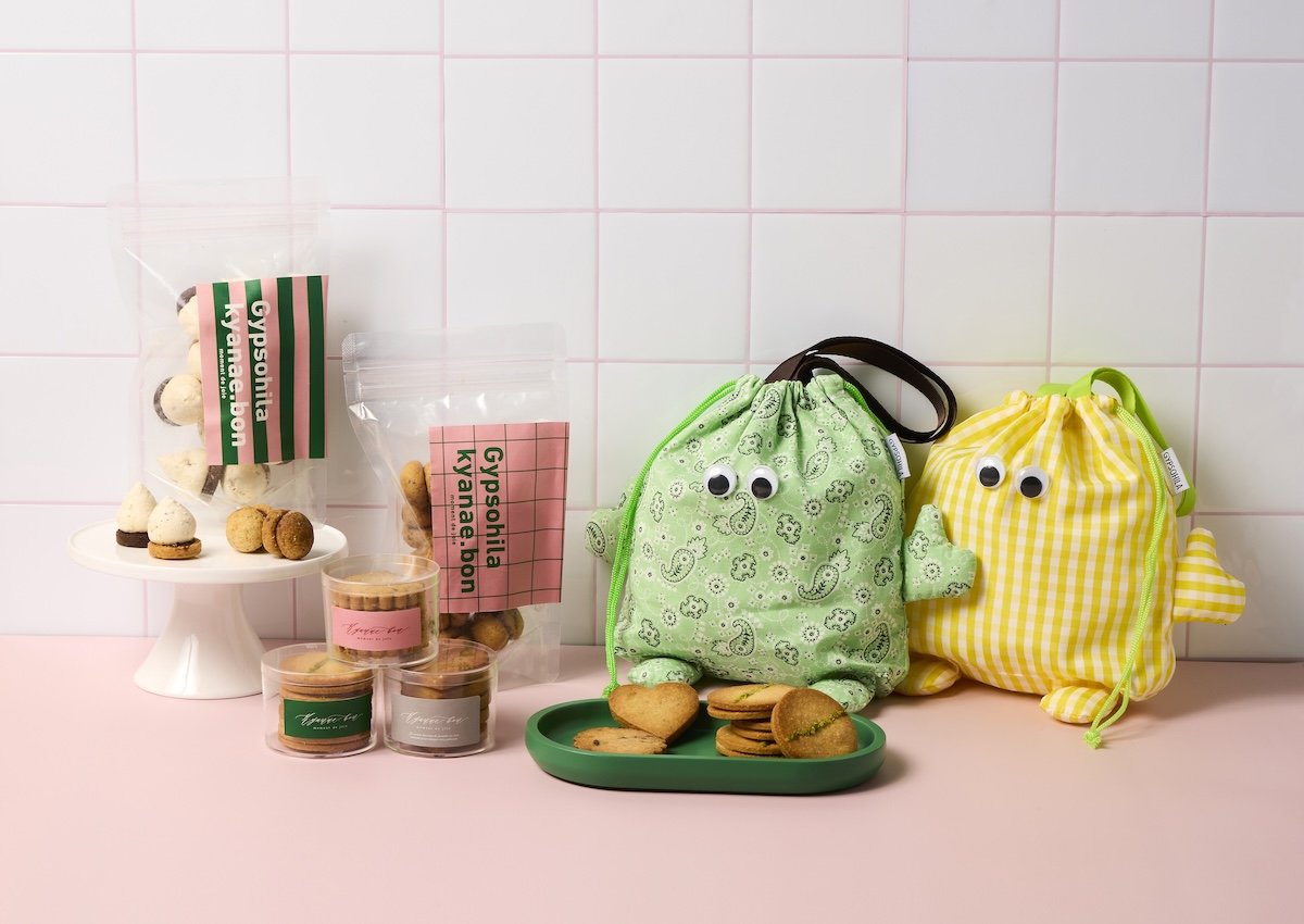 日々のライフスタイルに馴染み愛用できる“良いもの”をお届けする「Gypsohila(ジプソフィア)」のアイコニックな巾着やランチバッグと、食感や味にこだわりながらシンプルでまた食べたくなるお菓子作りを目指す「kyanae.bon(キャナエボン)」のクッキーがセットになって登場。