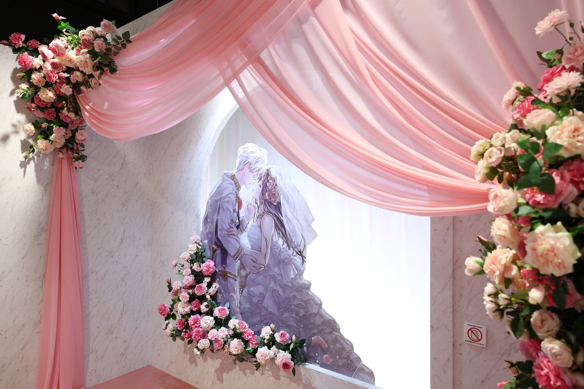 原画だけじゃありません! 『青春ヘビーローテーション』と『チョコレート・ヴァンパイア』の世界観を表現したフォトスポットが登場。ハート型の風船や花で彩られた空間は、写真映え抜群です♡