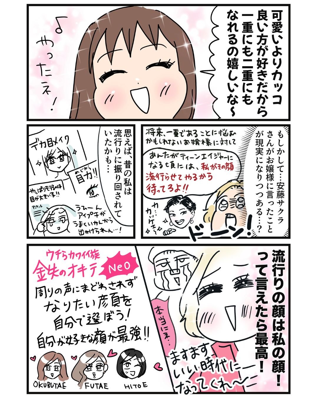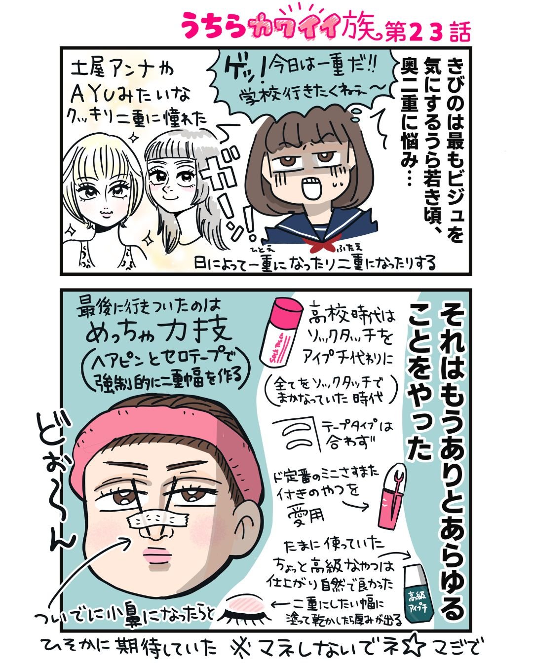 漫画家・きびのあやとらさんが、昨日よりちょっとカワイイ私を目指すマンガ連載「うちらカワイイ族」。第23話は、二重のためなら力技も!若き頃のビジュ悩みについて。