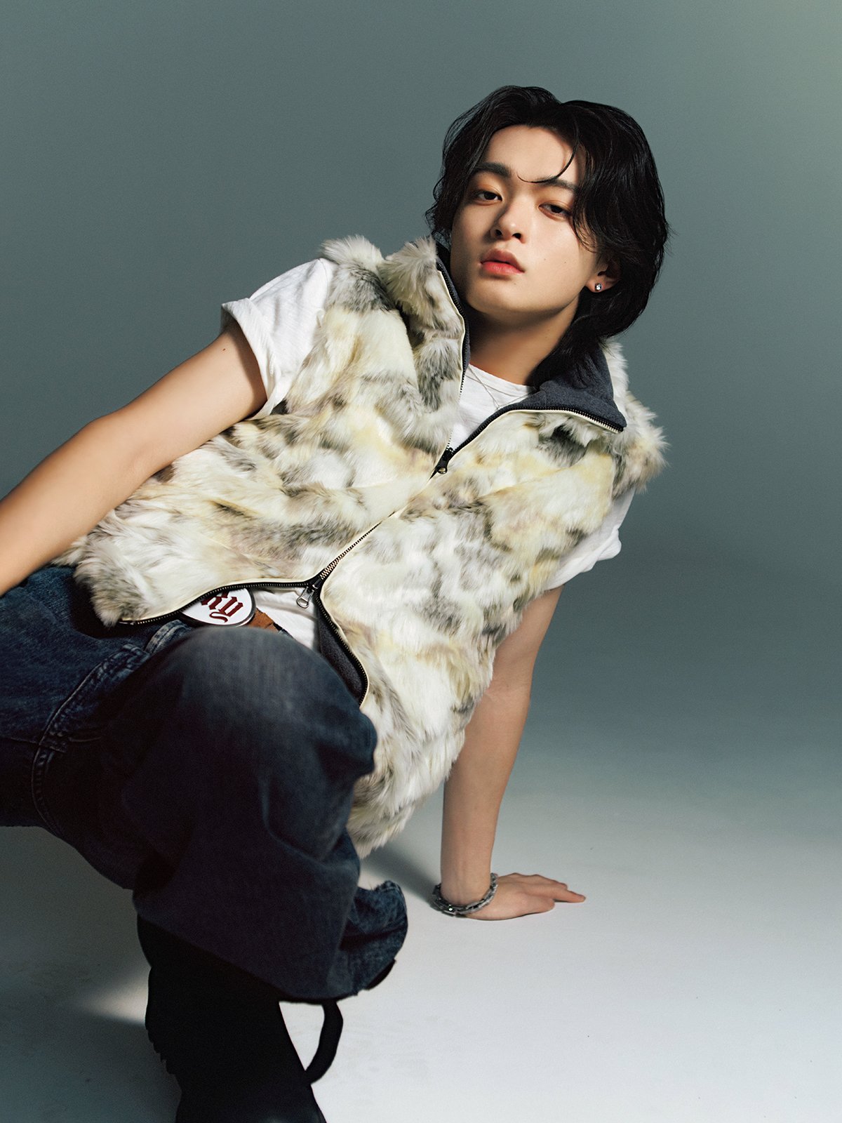 ファーベスト¥26,840(HANA KOREA〈レシト〉) Tシャツ¥23,100(オン・トーキョー ショールーム〈ノーメンテナンス〉) パンツ¥46,200(ディーゼル ジャパン〈ディーゼル〉) ネックレス¥20,900(HANA SHOWROOM〈ミュゼアール〉) ブレスレット¥34,690(HANA KOREA〈ポートレート リポート〉) その他/スタイリスト私物