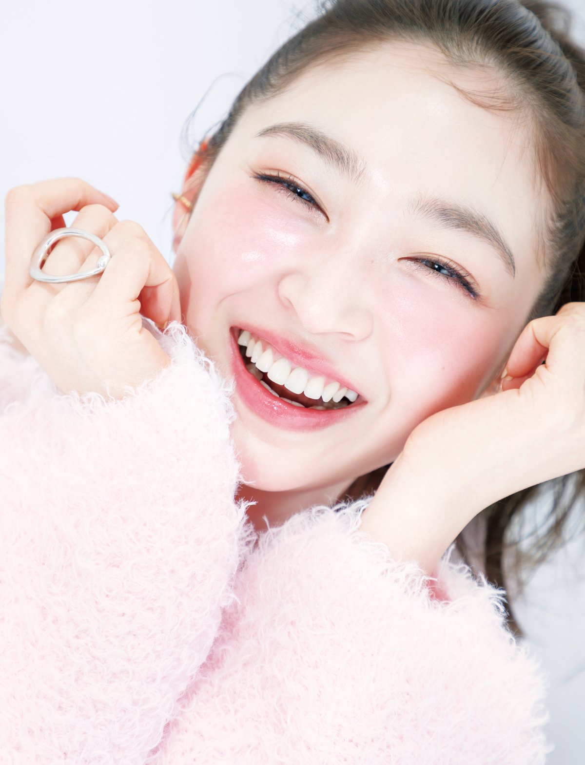 特集は、ふわふわニットに包まれて満面の笑みを浮かべる多幸感あふれるカットからスタート。ふわっともちっと触れたくなるような肌と弾ける血色感が、彼女の美容哲学そのものを体現しています。