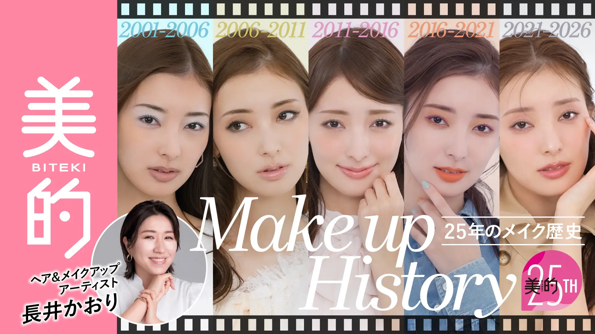 第一弾として、『美的』創刊時の2001年から2026年の最旬顔まで、5年ごとのルックをヘア&メイクアップアーティストの長井かおりさんが解説する「Make-up History -25年のメイク歴史-」を公開中。