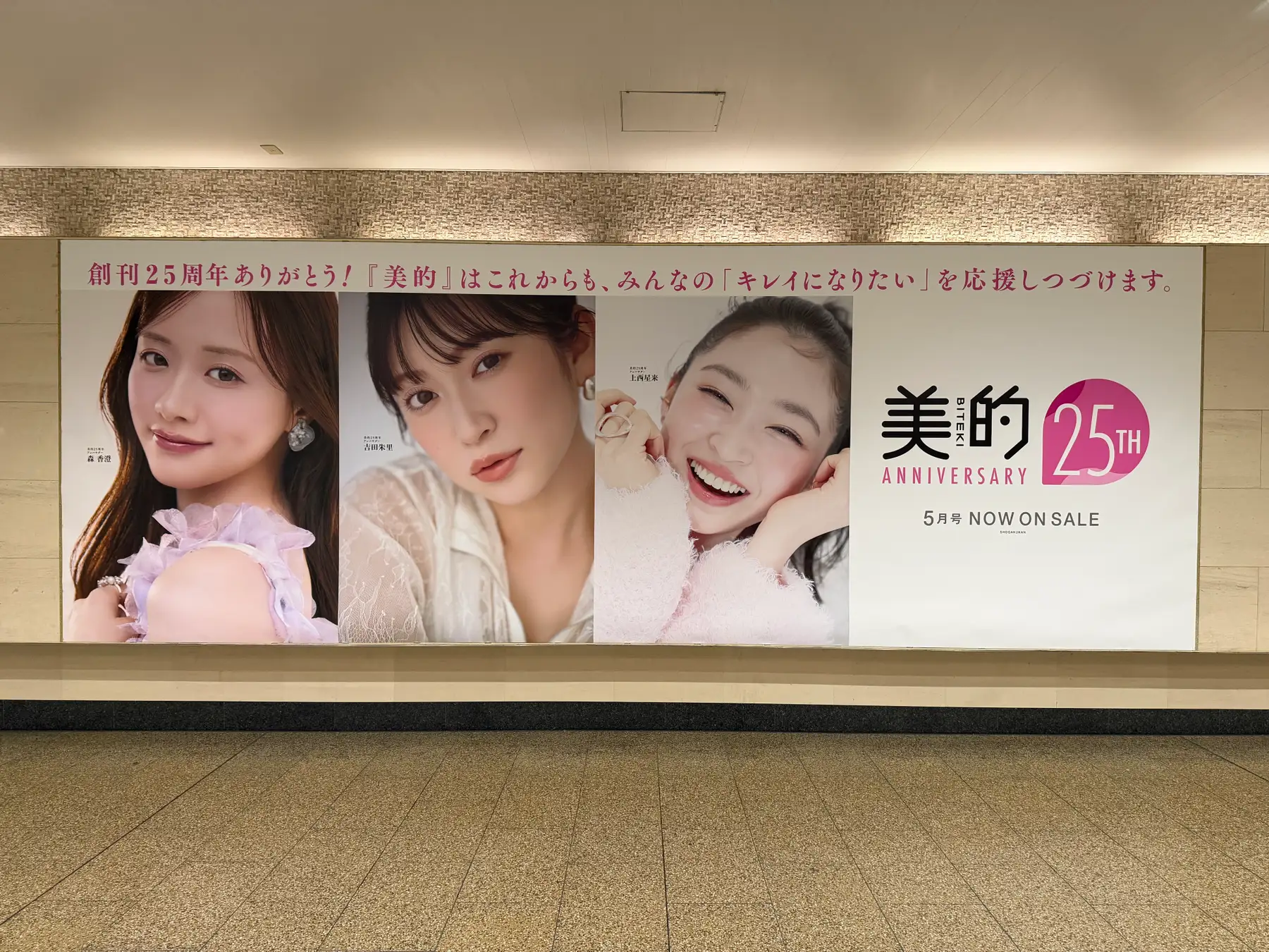 創刊25周年アンバサダーの吉田朱里さん・森 香澄さん・上西星来さん、『美的』とゆかりのある美容17ブランドのポスターが都内各所でアニバーサリーイヤーを彩ります♡