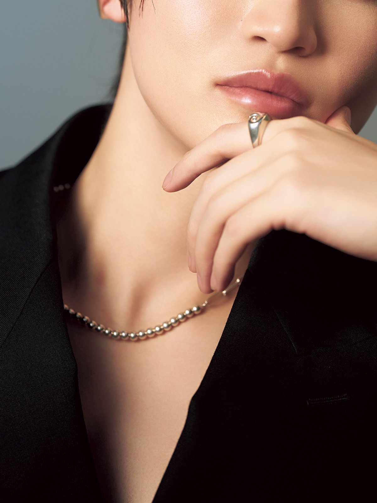ジャケット¥91,800(リトルビッグ) ネックレス¥26,950、リング¥21,780(KNOWHOW/KNOWHOWJewelry)