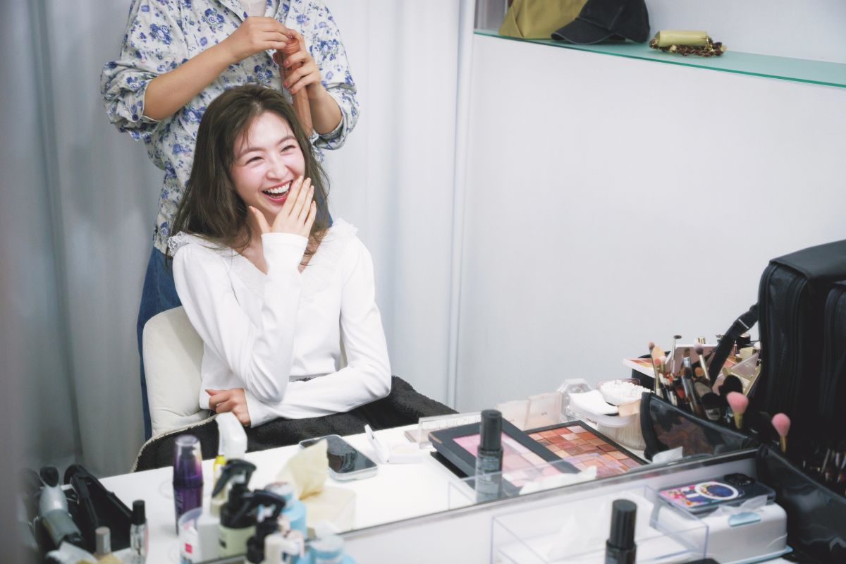 「撮影前のメイク中、ヘア&メイクさんとの雑談時間も私にとって大切な時間。美容の情報交換や近況報告をしながら笑ったりしゃべったりすることで顔がストレッチされ、むくみ解消にも。顔の細かい筋肉が使いやすくなり、表情を作りやすくなります」