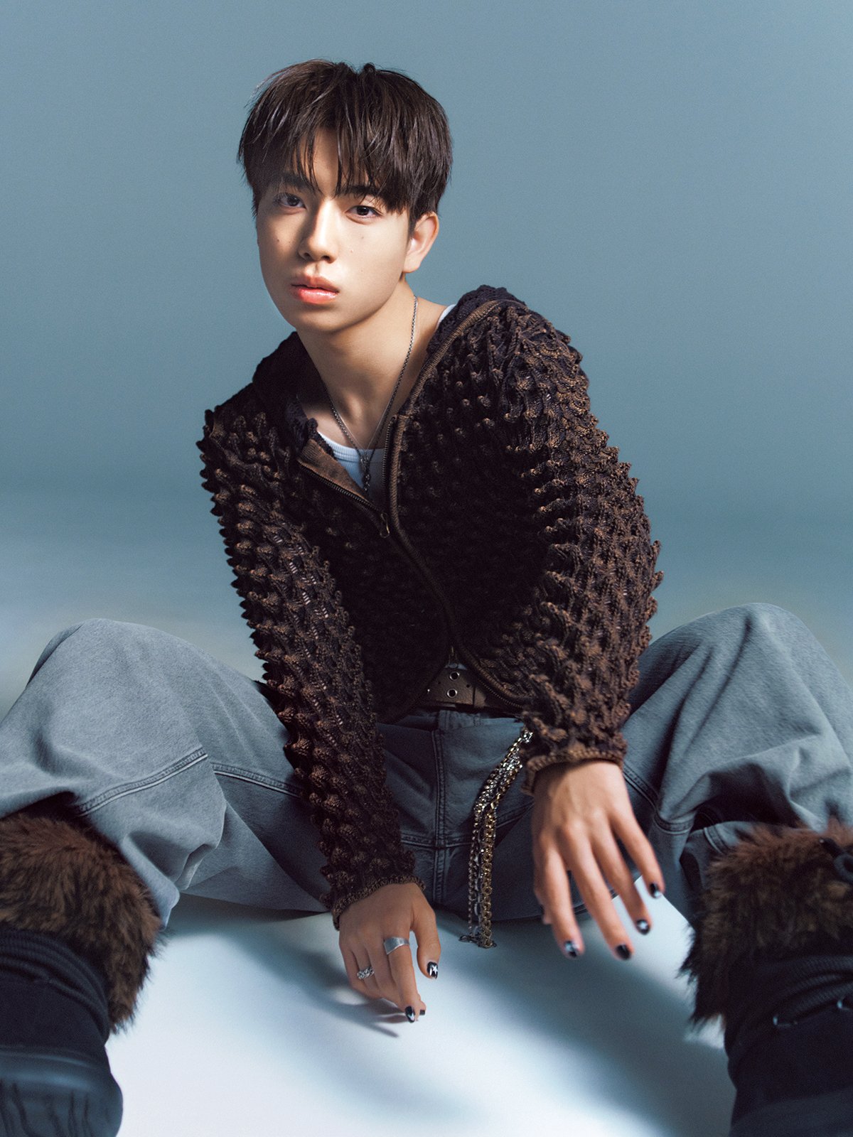 ニットパーカ¥20,680(HANA KOREA〈メロウ〉) パンツ¥66,000(ディーゼル ジャパン〈ディーゼル〉) キーチェーン参考商品(Taiga Igar〈i Taiga Igari〉) ブーツ¥18,096(HANA KOREA〈レシト〉) ハートネックレス¥11,660(HANA KOREA〈ミュゼアール〉) その他アクセサリー/本人私物 その他/スタイリスト私物