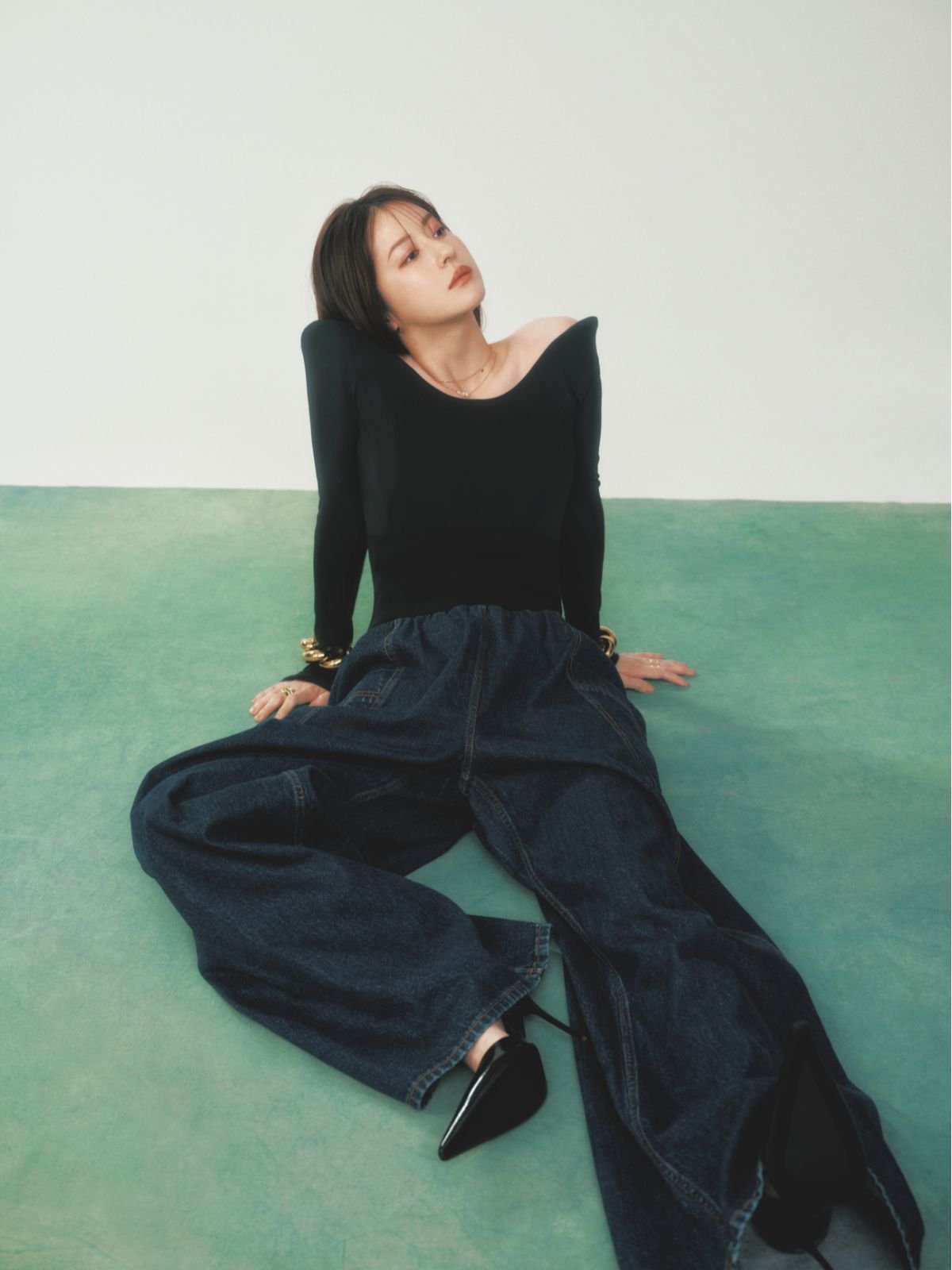 ボディスーツ¥470,800/参考価格、デニムパンツ¥313,500、シューズ¥207,900、ブレスレット/参考商品(リシュモン ジャパン アライア〈アライア〉) ネックレス¥2,838,000、イヤリング[左耳]¥410,300、イヤーカフ[右耳]¥336,600、リング[左手中指]¥865,700、リング[右手中指]¥2,090,000(レポシ日本橋三越本店〈レポシ〉)