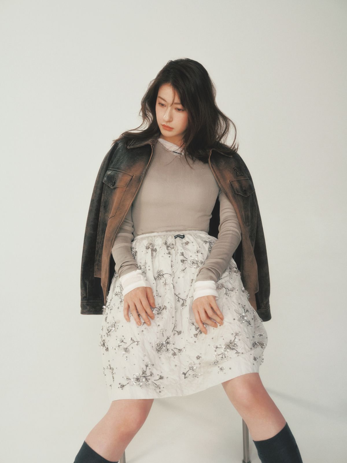 ジャケット¥1,210,000、ニット¥286,000、カットソー¥178,000、スカート¥1,705,000、ソックス¥61,600/予定価格(ミュウミュウ クライアントサービス〈ミュウミュウ〉)