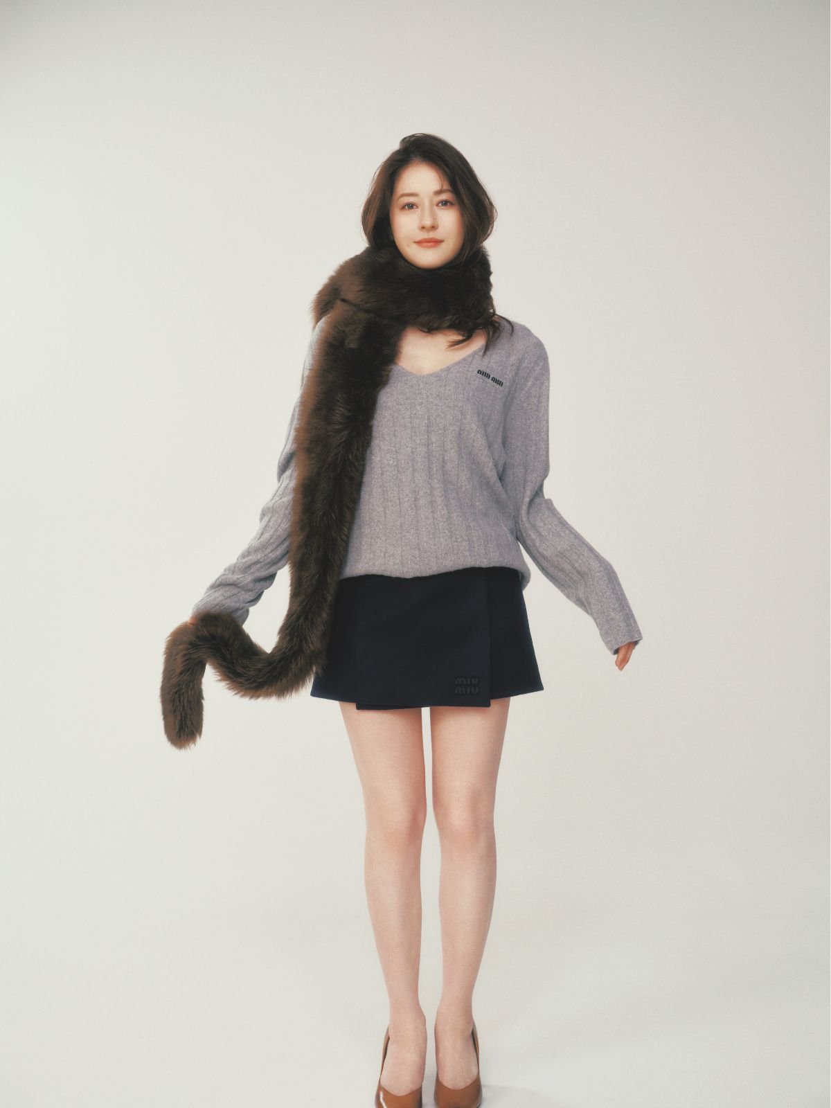 ニット¥242,000、スカート¥286,000、ファー¥792,000、シューズ¥181,500/予定価格(ミュウミュウ クライアントサービス〈ミュウミュウ〉)
