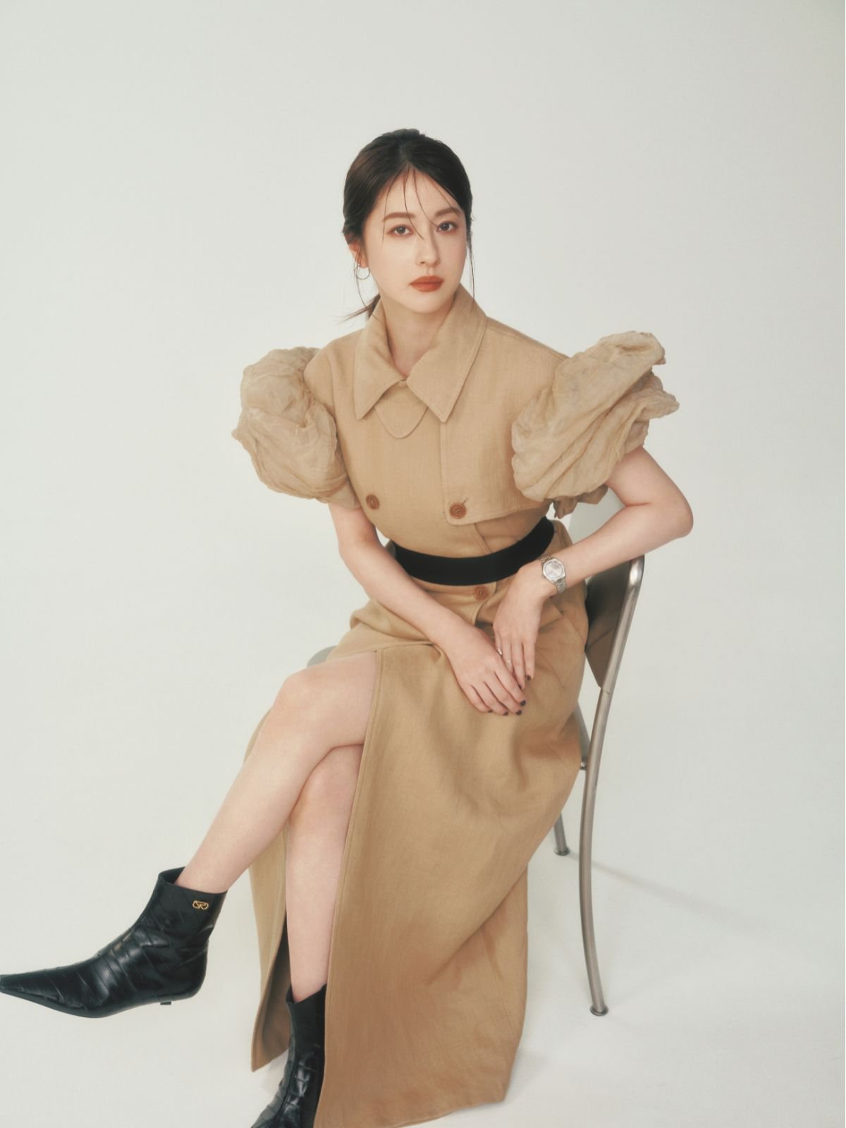 コート¥646,800、ベルト¥52,800(マックスマーラ ジャパン〈マックスマーラ〉) 時計¥2,013,000(オメガ) イヤリング[右耳]¥873,400、リング¥2,244,000(レポシ日本橋三越本店〈レポシ〉) シューズ¥187,00(0 セルジオ ロッシジャパン〈セルジオ ロッシ〉)
