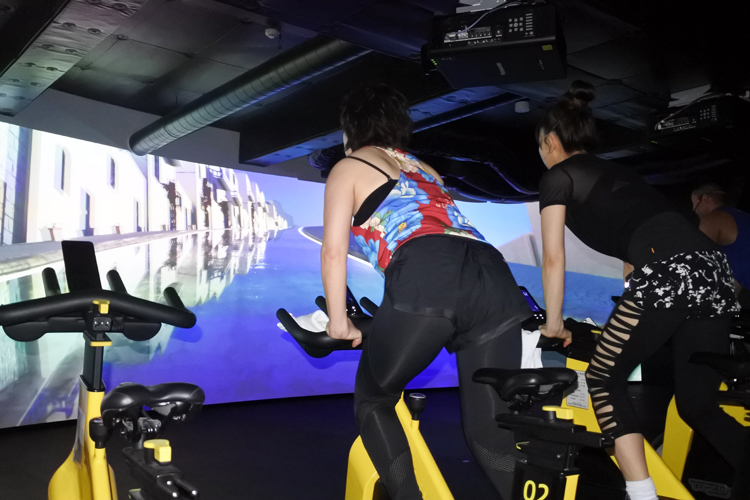 スタジオ前方には、周囲180度を囲う映画館規模の大型特殊スクリーンが! 「THE TRIP(TM)」は、そのスクリーンに映し出される大迫力の映像を見ながら、サウンドシステムから流れる楽曲に合わせてサイクリングをする40分間のプログラムです。