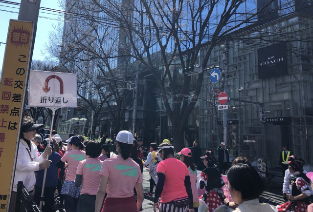 渋谷を往復するとコースは一転、表参道のメインストリートへ。原宿駅脇から青山通りの直前までの往復に。折り返し地点は、COACHのショップ前。AppleStore表参道店を右に見て原宿へ戻ります。一見平坦に見える表参道もアップダウンが。原宿駅から明治神宮前に下り、青山通り向けて登る…というジワジワと来る長い高低差。華やかな通りには応援の方たちも多数見られました。