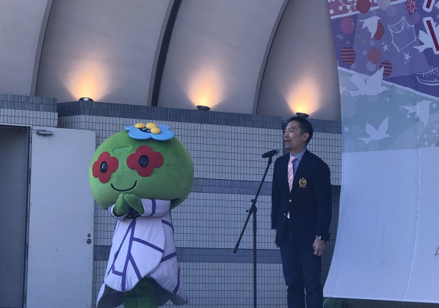 午前9時の号砲を前に、長谷部健区長と渋谷区のPRキャラクター“あいりっすん”ちゃん(代々木公園在住)が、ランナーにエールを送ります。