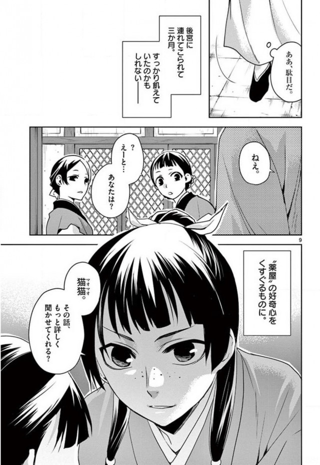 「売り飛ばされた後宮で下女として下働きをしていたマオマオは、ある日とある噂を耳にします。帝の御子が生まれて間もなく3人も亡くなっており、後宮ではこれを呪いだという噂話が闊歩する。さらには、御子の母である李花妃(リファひ)と玉葉妃(ギョクヨウひ)も病で倒れているという始末。これを聞いたマオマオは薬屋の娘の本能なのか、好奇心を掻き立てられます。こういう時のマオマオは本当にいい顔をします!」