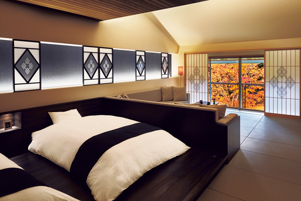 客室は、現代に合ったくつろぎの和空間。極上の眠りを誘う寝具や気の利いたアメニティなど、キレイ磨きにうれしい要素がたくさん。「ご当地部屋」という、その地域の文化を存分に体験できる、伝統工芸が施されて見晴らし抜群の客室も必見です!