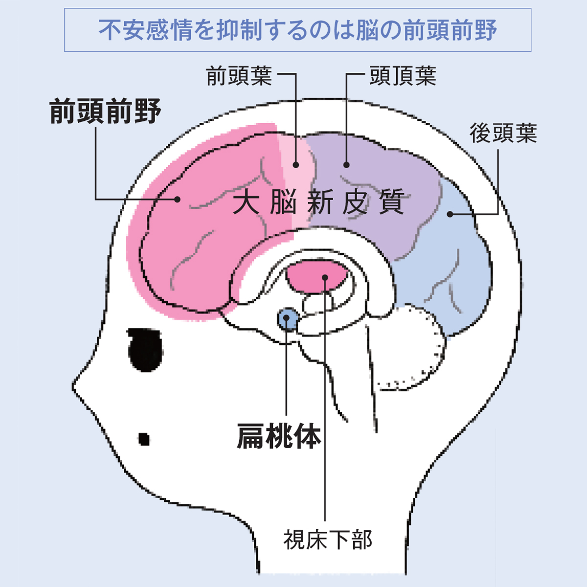 「不安や恐怖などの感情は、脳の『扁桃体』と呼ばれる部分(神経細胞の集合体)の過活動によって発生します。ただし人間の脳は理性的な状況判断を行う『前頭前野』が発達しているため、扁桃体が活性化しそうになっても抑制し、過剰な不安感情をコントロールすることができます。ところが、ストレスなどの影響で前頭前野の機能が低下すると、脳に誤作動が生じて扁桃体が暴走。不安な感情も制御不能になってしまうのです。