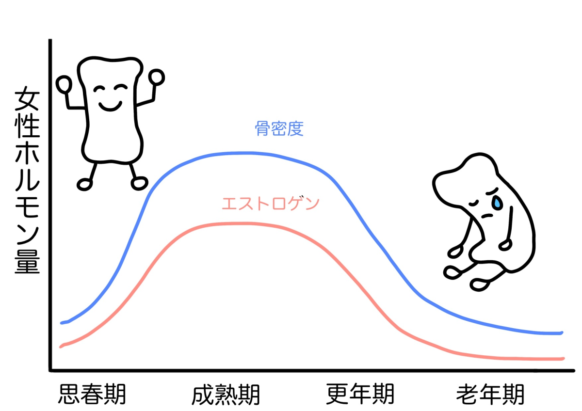 「女性ホルモン、特にエストロゲンは、破骨細胞を抑制し、骨芽細胞を活性化して骨の新陳代謝を促す大切な役割を担っています。そのため、更年期を迎えてエストロゲンの分泌が急激に減少すると、骨の代謝バランスが乱れ、骨がスカスカの状態に。骨粗しょう症を発症しやすくなります。